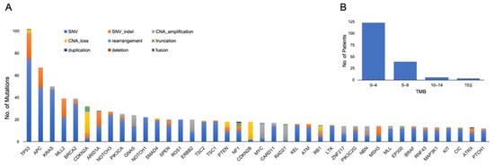 (A) Top 40 genomic alterations and (B) distribution of tumor mutational burden (TMB) in 168 patients who completed analysis. CAN: copy number alteration; SNV: single nucleotide variant.
