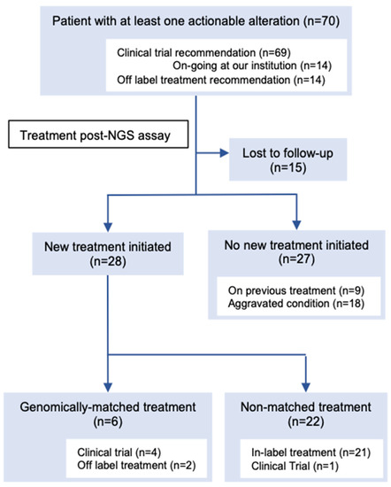 Consort diagram of post-next-generation sequencing (NGS) treatment of patients with at least one actionable alteration on the molecular tumor board (MTB) report. All numbers do not add up because some patients were counted in more than one category (i.e., had an actionable alteration with recommendations of clinical trials and off-label treatment). See Table S2 for detailed information on the patients who received genomically matched treatment.
