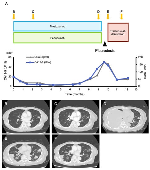 Clinical presentation. (A) The course of tumor markers (carcinoembryonic antigen (CEA) and carbohydrate antigen 19-9 (CA 19-9)) and (B–F) contrast-enhanced computed tomography (CT) images while receiving treatment with trastuzumab/pertuzumab and trastuzumab deruxtecan. Multiple lung metastases and liver metastases (which is not shown here) were observed when treatment with trastuzumab/pertuzumab was initiated (B). Two months after, a good partial response was obtained (C). After 9 months of treatment, the tumor became refractory to trastuzumab/pertuzumab, and a massive right pleural effusion was developed (D). After improvement of the pleural effusion with pleurodesis (E), the next treatment with trastuzumab deruxtecan was initiated, and tumor shrinkage was observed 1.5 months later (F).