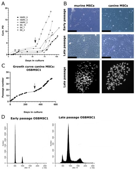 Mesenchymal stem cells (MSCs) from dogs and mice transform spontaneously after long-term culture. (A) MSCs isolated from NMRI or C57BL/6J mice undergo spontaneous transformation after long-term in vitro culture based on cumulative population doubling (Cum. PD). Example of transformation event in B6_10 is indicated by an arrow. (B) Representative images of murine and canine MSCs. Late passage murine MSCs show a higher nuclear to cytoplasm ratio, as evident from the nuclear enlargement, compared to early passage MSCs. Scalebar represents 100 µm. Karyotyping showed late passage MSCs have an increased number of chromosomes per cell after DAPI staining, as murine and canine cells normally have 40 or 78 chromosomes, respectively. (C) MSCs isolated from a 7-year-old Rottweiler transform spontaneously after long-term ex vivo culture (OSBMSC1), indicated with an arrow, at each data point, cells were trypsinized and passaged. (D) DNA content analysis by flow cytometry shows that late passage canine MSCs OSBMSC1 have become aneuploid.