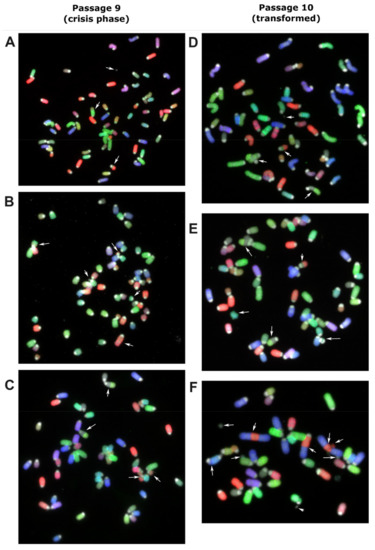 Murine MSC derived from bone marrow of a C57BL/6J mouse was harvested and molecular karyotyped at crisis phase at passage 9 (A–C) and the next passage (P10) after transformation (D–F) using COBRA-FISH. In all panels, both numerical and structural chromosomal alterations are visible. Arrows indicate involved chromosomes and rearranged chromosomes are listed per panel from top to bottom and from left to right: (A) Centromeric fragment, der(4)t(4;7), der(7)t(3;7), (B) der(16)t(13;16), del(3), centromeric fragment, del(13), der(3)t(3;12), (C) der(18)t(4;18), der(18)t(4;18), del(3), der(7)t(3;7), (D) centromeric fragment, der(7)t(3;7), der(18)t(4;18), der(18)t(4;18), (E) der(7)t(3;7), der(18)t(4;18), ace(17), der(18)t(4;18), dic(17;17), (F) centromeric fragment, acentric chromosome from chromosome 2-3-2 fusion, der(3)t(2;3), acentric chromosome from chromosome 2-3-2 fusion, fragment of chromosome 3, centromeric fragment, centromeric fragment, dic(5;11), centromeric fragment. COBRA-RGB-color images were superimposed with DAPI (grey) to visualize chromosome centromeric regions. Magnification 630×.