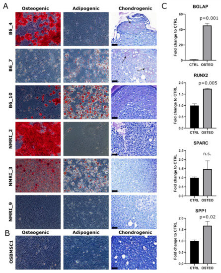 The trilineage differentiation capacity of transformed late passage murine MSCs was highly variable: four out of six murine MSC cultures (B6_4, B6_10, NMRI_2, NMRI_3) could differentiate towards the osteogenic lineage, three out of six cultures (B6_7, B6_10, NMRI_3) could differentiate towards the adipogenic lineage, and two out of six cultures (B6_4 and B6_7) showed chondrogenic differentiation (Figure 3A). The transformed canine MSCs did not show any trilineage differentiation capacity under the conditions studied (Figure 3B), but by RT-qPCR analysis, most osteogenic markers (BGLAP, RUNX2, and SPP1) were significantly upregulated (Figure 3C).