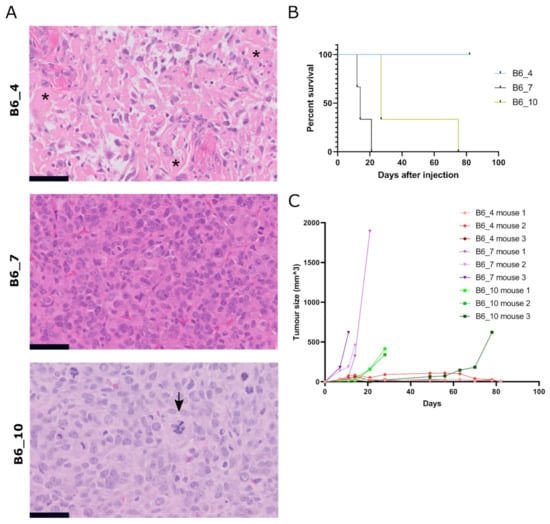 Subcutaneous injection of transformed murine MSCs result in tumor formation with variable histology. (A) H&E staining of tumors formed after subcutaneous injection of transformed murine MSCs (B6_4, B6_7, B6_10). Tumor B6_4 displayed a moderately cellular and pleomorphic tumor with deposition of amorphous eosinophilic extracellular matrix, suggestive of osteoid (indicated with asterisks). In contrast, tumors B6_7 and B6_10 were more cellular, pleomorphic, with a high number of mitoses, and morphologically lack any differentiation. Atypical mitosis were present, indicated with an arrow in B6_10. Tumor volumes for B6_4, B6_7 and B6_10 were 0.005 cm3 (n = 2), 0.4–1.1 cm3 (n = 3) and 0.3–0.6 cm3 (n = 3), respectively. Scalebar represents 50 µm. (B) Number of days after subcutaneous injection when mice were sacrificed due to an increase in tumor volume. (C) Tumor size measured by calliper of each mouse after subcutaneous injection of transformed murine MSCs (t = 0).