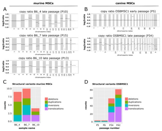 Late passage murine and canine MSCs show a complex molecular karyotype after whole-genome sequencing. Segmented copy ratios are shown for (A) late passage murine MSCs and (B) early and late passage canine MSCs. Positive copy ratios indicate a gain of genomic materials, whereas negative ratios indicate losses. The total number of structural variants in (C) late passage murine MSCs and (D) early and late passage canine MSCs.