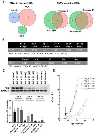 Point mutations in TP53/Trp53 are a common single nucleotide variant (SNV) in transformed murine and canine MSCs. Venn diagrams depicting the total number of SNVs and small indels in (A) late passage murine MSCs and early and late passage canine MSCs. (B) Single nucleotide variant in Trp53 or TP53 was the SNV with the highest allele frequency in late passage murine and canine MSCs. (C) Western blot showing p53 protein expression in late passage murine MSCs, treated with PBS or cisplatin (3 and 10 µM). Murine MSCS with WT p53 (B6_7) increase p53 expression over 3-fold, whereas murine MSCS with mutant p53 (B6_4 and B6_10) increase p53 expression only 1.2–2.1 fold, indicating p53 function is partially impaired in these cells. GAPDH was used as a loading control. Quantification of relative p53 protein expression to GAPDH is depicted on the bottom panel. Statistical analysis was performed based on three independent experiments, but here only one representative blot is shown. No changes in protein expression were statistically significant. Whole blots with densitometry readings can be found in Figure S9. (D) Murine MSCs from Kcre/p53f mice were treated with cre-recombinase (3 or 6 µM) at day 11 (indicated by black arrow) inducing immediate transformation, whereas non-treated MSCS transform later. At each data point, cells were trypsinized and counted to calculate cumulative population doubling (Cum. PD).