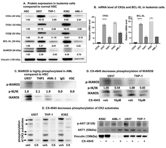 The following are available online at https://www.mdpi.com/2072-6694/13/5/1127/s1, Figure S1: Western blot showing baseline protein overexpression in primary AML cells, Figure S2: Cell viability of U937, THP1 and AML#1 following CX-4945 treatment for 48 h, Figure S3: Western blot showing protein level of CK2α in U937 cells treated with CK2α sh-RNA(left panel), Figure S4: Immunoblot showing BCL-XL expression in CK2α overexpressing (OE) and silenced (CK2shRNA) U937 cells compared to control, Figure S5: Radioblot (top) and immunoblot (bottom panel) showing phosphorylated Ikaros in CK2α modulated U937 cells, Figure S6: Western blot showing CK2α and p-CK2 expression in U937 and THP-1 cells transduced with retroviral vec-tor containing CK2α, Figure S7: Histogram showing CK2α and BCL-XL protein quantification in U937 (left) and THP-1 (right) xenograft mice treated with CX-4945, Figure S8: Immunoblot showing Ikaros and BCL-XL protein expression in IKAROS overexpressed U937 cells, Figure S9: Synergetic cytotoxic effect of combination of Daunorubicin and CX-4945 in primary AML #1 cells, Table S1: List of Western blot antibodies, Table S2: the qChIP primers, Table S3: Characteristics of primary AML cells used in the study, Table S4: Complete blood count showing blood parameters in vehicle and CX-4945 treated U937 xenograft mice, Additional details of methods.