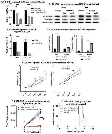 We studied the effect of CK2α downregulation and pharmacological inhibition of CK2α on BCL-XL expression. We achieved a pharmacological inhibition of CK2 using a specific inhibitor, CX-4945. The treatment of U937 and AML-1 with CX-4945 showed dose-dependent decreases in BCL-XL mRNA (Figure 2A) and protein levels (Figure 2B). Downregulation of the CK2α was achieved by treating U937 cells with a CK2α specific short hairpin (sh) RNA (Figure S3). CK2α silencing decreased the expression of BCL-XL at mRNA (Figure 2C) and protein levels (Figure S4), as well as decreased IKAROS phosphorylation (Figure S5). Next, we transduced U937 and THP-1 cells with a retrovirus expressing CK2α or the empty vector (as a negative control). Increased CK2α mRNA (Figure 2D) and protein were confirmed (Figure S6). The overexpression of CK2α showed increased BCL-XL mRNA levels in U937 and THP-1 (Figure 2D). We did not observe a significant change in IKAROS phosphorylation or the BCL-XL protein level in CK2 overexpressing U937 cells (Figures S4 and S5). This may be due to the already high level of IKAROS phosphorylation by high baseline CK2 in these cells. Phenotypically, CK2α overexpressing U937 and THP-1 cells showed increased cell viability and proliferation compared to the control cells (Figure 2E). We developed a cell line derived xenograft mouse model by transplanting luciferase labeled U937 cells transduced with CK2α-gfp-luc or the control vector (ctl-gfp-luc) into immunocompromised (NRG-S) mice via tail vein injection. AML (U937-CK2α-gfp-luc) cells overexpressing CK2α showed a robust engraftment as shown by the increased bioluminescence intensity (Figure 2F). Moreover, mice engrafted with CK2α overexpressing AML cells showed decreased survival compared to the control group (Figure 2G).