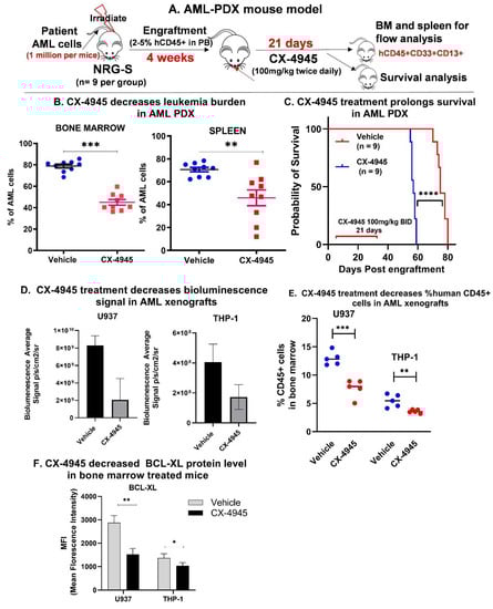 3.4. CX-4945 Treatment Shows Therapeutic Efficacy in AML Patient-Derived Xenografts