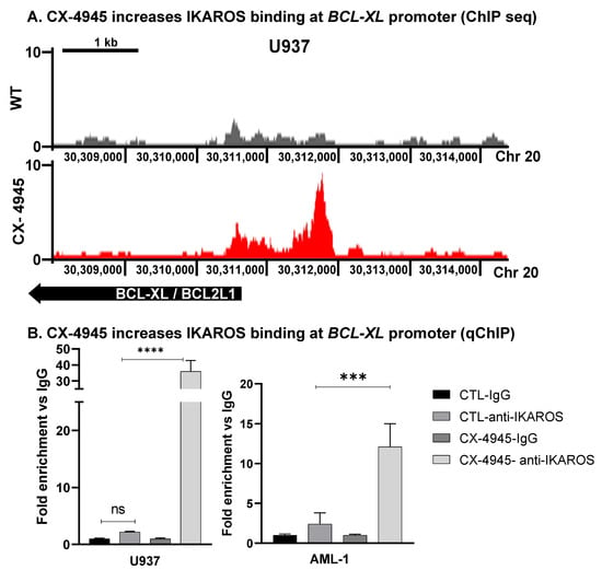 The IKAROS transcription factor binds to upstream regulatory elements of target genes and activates or represses their expression via chromatin remodeling [26,27]. Regulatory functions of the IKAROS transcription factor in AML are not known. In ALL, CK2 is the major kinase that phosphorylates IKAROS [37,38]. In AML, where the IKZF1 loss of function mutations is rare, hyperphosphorylation by CK2 can impair IKAROS’ DNA-binding ability and subsequent regulatory functions. Using chromatin immunoprecipitation followed by highly parellel DNA sequencing (ChIP-seq), we did a global analysis of changes in the genome-wide DNA-binding of IKAROS in AML cells following the treatment with CX-4945. U937 cells were treated with 10 µM of CX-4945 for 72 h to assess IKAROS mediated epigenomic changes. A link to access the ChIP-seq data in the UCSC browser is provided in the supplemental material. Here, we show that the binding of IKAROS to the promoter region of the BCL2L1 (BCL-XL) gene increases after the CX-4945 treatment (Figure 4A). We confirmed IKAROS binding at the BCL-XL promoter region using a quantitative chromatin immunoprecipitation assay (qChIP). The CX-4945 treatment showed increased binding of IKAROS to the BCL-XL promoter in U937 (Figure 4B) and primary AML cells following 72 h of treatment (Figure 4B, right panel).