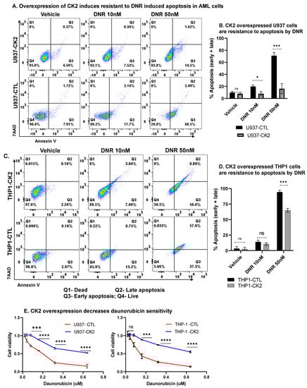 CK2 and IKAROS regulate sensitivity towards daunorubicin. CK2 overexpressing U937 (A,B) and THP-1 (C,D) were treated with 10 nM or 50 nM of daunorubicin for 48 hand stained with 7-AAD and Annexin V for flow cytometry to determine apoptosis. Flow plots (A,C) and percent apoptotic cells (early + late apoptosis) are shown in (B,D). Flow plots showing representative results from three replicates. The percentage of cells in the right upper and lower quadrant of each flow chart represents the percentage of late and early apoptotic cells, respectively. Q1-dead, Q2-late apoptosis, Q3-early apoptosis, Q4-live. (E) Cytotoxicity and drug response measured by MTT assay after treating CK2 overexpressing U937 and THP-1 cells and respective controls with various concentrations of daunorubicin for 48 h. p > 0.05 (ns); p < 0.05 (*); p < 0.001 (***); p < 0.0001 (****).