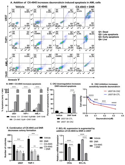 The addition of CX-4945 potentiates DNR induced apoptosis (Figure 7A,B). Downregulation of CK2α resulted in increased apoptosis (Figure 7C) and decreased cell viability (Figure 7D) when exposed to DNR compared to the control cells. A combination treatment with CX-4945 and DNR showed decreased colony formation compared to the cells treated with DNR alone (Figure 7E). The repression of BCL-XL was significantly augmented following the treatment with CX-4945 and DNR compared to the DNR single-agent treatment (Figure 7F). A combination of CX-4945 and daunorubicin showed the synergetic cytotoxic activity in primary AML cells (Figure S9). Overall, these results provide evidence of the functional synergy between CX-4945 and daunorubicin in suppressing BCL-XL expression in AML.