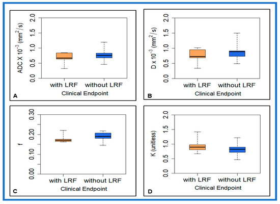 Figure 1 shows a box plot for pre-TX ADC, D, f, and K values from primary tumors in patients with and without LRF of NPC.