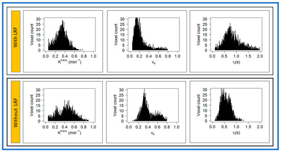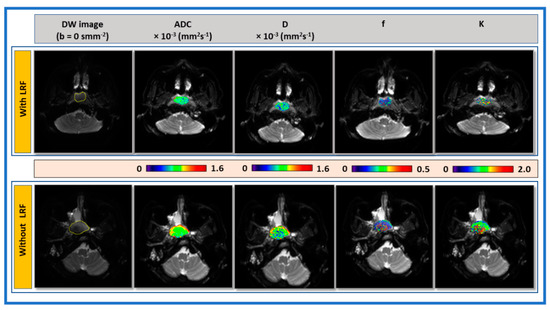 Histogram analysis shows the distribution of metrics values in the ROI that can directly represent Intra/inter tumor heterogeneity. The descriptive statistics represent the asymmetry of the distribution and the voxel-by-voxel value’s peakedness within the histogram. The metric values ADC, D, f, Ktrans, and ve of with LRF are leaning towards as compared to without LRF. In contrast, K and τi values are leaning toward higher values. The shift of metric value towards lower or higher may be associated with the extent of malignancy. Skewness and kurtosis of ADC and Ktrans distributions, respectively, were used to predict TX response in HN cancers [16,48]. The present study showed a trend towards significantly higher skewness and kurtosis of ADC values in patients with LRF than those without LRF (Figure 4). By contrast, Law et al. have reported opposite results [16]. This discrepancy was possibly due to long-term follow-up and large sample size. The broader peaks towards higher values were seen in patients without LRF than those with LRF for ADC, D, D*, f, Ktrans, and ve. By contrast, K and τi values trended lower. The shape of the histogram revealed the tumor heterogeneity and microstructural differences in patients with and without LRF of NPC.