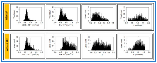 Histograms exhibit the distribution of metric values in the ROI. The representative histogram of ADC, D, f, and K shows the asymmetrical distribution of metric values in patients with and without LRF (Figure 3). ADC, D, and f values trended higher in a patient without LRF than with LRF. By contrast, K values trended higher with LRF than without LRF. The mean kurtosis of ADC (3.46 vs. 9.949), D (3.88 vs. 13.91), and f (1.58 vs. 2.20) values were lower in a patient without LRF than with LRF. By contrast, mean K values (1.26 vs. 1.12) were slightly higher without LRF.