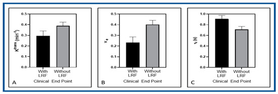Additionally, low Ktrans and high τi values in patients with LRF are consistent with the previous results [27,28]. Higher pre-TX Ktrans values exhibited an improved response to chemo-RT and prolonged survival [27,47] because the Ktrans correlates with the proliferating cell density and micro-vessel density. Chawla et al. have reported that patients with high τi were associated with more prolonged overall survival than other groups in HN cancer [28]. The metric τi showed a higher sub-hazards ratio than Ktrans and ve.
