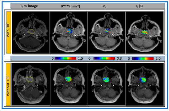 Representative pre-TX T1w MR images of a late phase dynamic series with ROIs and parametric maps of primary tumors Ktrans, ve, and τi overlaid on T1w MR images for a patient with and without LRF of NPC are displayed in Figure 5.