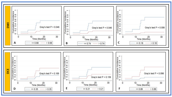 The CIA revealed that the two subgroups dichotomized with the cutoff value of ADC ≤ 0.68 × 10−3 (mm2/s) and D ≤ 0.74 × 10−3 (mm2/s) showed a statistically significant difference in the incidence of LRF (Gray’s test p = 0.046 for both). Additionally, the cutoff value of f ≤ 0.18 showed a significant difference in the incidence of LRF (Gray’s test p = 0.006), and the cutoff value of τi ≤ 0.89 (sec) had borderline significance (Gray’s test p = 0.098). No significant association was found for a cutoff value of D* ≤ 2.25×10−3 (mm2/s), K ≤ 0.86 (unitless), Ktrans ≤ 0.35 (min−1), and ve ≤ 0.21 with LRF (p > 0.05 for all. Comparative CIA curves are depicted in Figure 7.