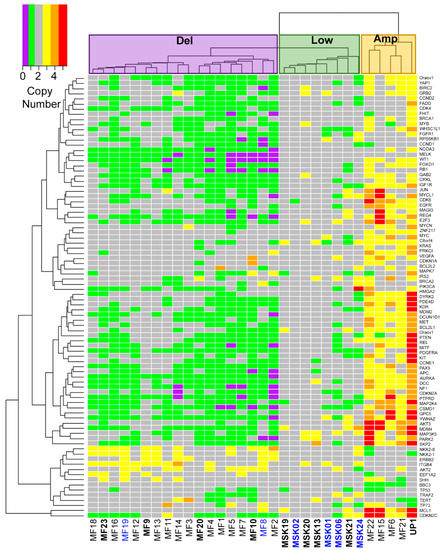 Three genomic structural variant signatures detected in MCC tumors by NanoString nCounter. Tumor DNA from 31 patients with MCC from Memorial Sloan Kettering (MSK), Marshfield Clinic (MF), and the University of Pennsylvania (UP) were subjected to Nanostring nCounter CNV analysis. CNV alterations for 86 gene loci commonly altered in cancer were ascertained and plotted as a heatmap. Three cluster groups denoted as Del (deletion) for group 1, Low for group 2, and Amp (amplification) for group 3. Bold indicates virus positive MCC (VP-MCC) tumors. Blue indicates metastatic tumor.