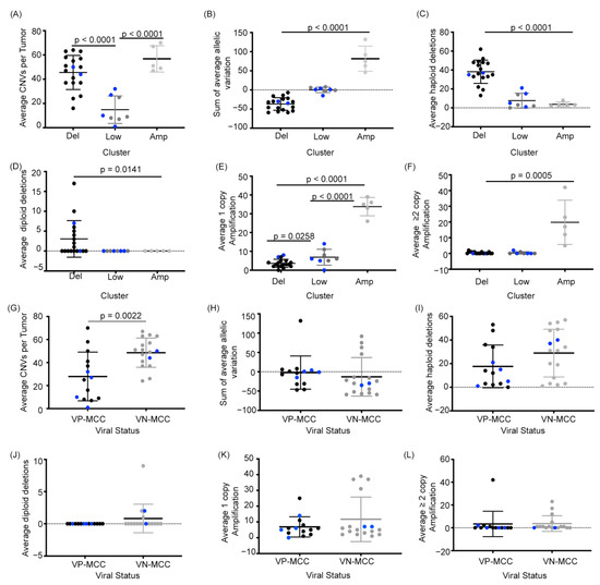 Structural variant clusters show distinct levels and types of CNVs whereas VN-MCC show more structural variation than VP-MCC. Comparison of clusters for the (A) average number of CNVs per tumor (one-way ANOVA), (B) average sum of allelic variations (−1 for each haploid deletion, +1 for each amplification, Kruskal-Wallis test), (C) average haploid deletions (Kruskal-Wallis test), (D) average diploid deletions (Kruskal-Wallis test), (E) average single-copy amplification (one-way ANOVA), and (F) average two or greater copy amplifications (Kruskal-Wallis test). Comparison between VP-MCC and VN-MCC for the (G) average number of CNVs per tumor (unpaired T-test), (H) average s um of allelic variations (Mann-Whitney test), (I) average haploid deletions (unpaired T-test), (J) average diploid deletions (Mann-Whitney test), (K) average single-copy amplification (Mann-Whitney test), and (L) average two or greater copy amplifications (Mann-Whitney test). Uncolored dots are primary tumor samples, blue dots indicate metastatic tumor samples.