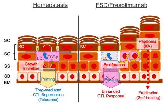 Schematic representation of defective transforming growth factor-beta (TGF-β) signaling in the epidermis and possible pathomechanisms of self-healing squamous epithelioma observed in Ferguson–Smith disease (FSD) or after treatment with the TGF-β antibody fresolimumab. Epidermal Langerhans cells (LCs) require an autocrine/paracrine loop of TGF-β. LCs establish an intercellular network of differentiated epidermal layers, induce tolerance in steady state and protect against potentially harmful cytotoxic T cell (CTL)-mediated immune responses. Disrupted TGF-β signaling may augment keratinocyte DNA synthesis, facilitating the formation of epitheliomas (papillomas), whereas unleashed CTLs eradicate the tumor. BM, basement membrane; SB, stratum basale; SS, stratum spinosum; SG, stratum granulosum; SC, stratum corneum.