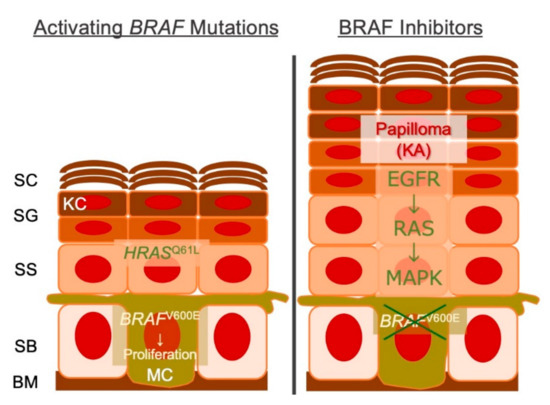 A previous report showed that the BRAF inhibitor vemurafenib provokes the development of cSCCs/KAs because of the paradoxical activation of MAPK located distally [158]. Mutations in RAS oncogene promote cellular transformation fueled by the acquisition of cell cycle-altering passenger mutations [158]. Because up to 60% of the squamous epitheliomas are considered to harbor MAPK-activating HRASQ61L mutations [158], pr-eexisting KC mutations could determine the outcome (Figure 2). Mechanistically, when EGFR-RAS signaling is activated, inhibitor binding induces conformational changes in the RAF kinase domain, which in turn causes the wild-type RAF isoform to dimerize, translocalize to the membrane, and interact with RAS-GTP [160]. Although these observations clearly illustrate the dependence on specific oncogenes in specific epidermal cell-lineages, caution should be exercised to avoid the oversimplification. Let us take developmental disorders caused by the genetic mosaicism of oncogenes, as with germline mutations in the RASopathy, somatic mutations in the developmental pathway can render very different consequences. Postzygotic HRAS/KRAS mutations produce the organoid nevus (benign hamartoma) called nevus sebaceous, and more severe consequences can manifest as the developmental anomaly termed Schimmelpenning syndrome, in which aberrations in the ectodermal development are thought to cause cerebral, ocular and skeletal defects [161]. By analogy, somatic mutations in oncogenic fibroblast growth factor receptor 3 (FGFR3) or phosphatidylinositol-4,5-bisphosphate 3-kinase catalytic subunit alpha (PIK3CA) result in seborrheic keratosis (senile wart) [4] or epidermal nevi [162]. Recurrent somatic mutations in the PIK3-AKT signaling pathway that affect the cortical development result in hemimegalencephaly [163].