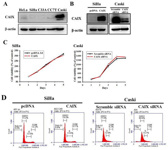 CAIX overexpression and knockdown in SiHa and Caski cell lines, respectively. (A) Endogenous CAIX protein levels were detected using Western blot analysis in human cervical cancer cell lines. (B) SiHa cells expressing low CAIX were transfected with a vector control (pcDNA 3.0) or CAIX-expressed vector (pcDNA-CAIX) for generating stably transfected clones (SiHa/pcDNA and SiHa/CAIX) after G418 selection. Caski cells expressing high CAIX were transiently transfected with scramble siRNA or CAIX siRNA. CAIX protein levels were detected through Western blot. (C) Growth curves of SiHa and Caski cells with or without CAIX expression was examined using the MTT assay. (D) Cell cycle profiles of transfected SiHa and Caski cells were determined using flow cytometry.