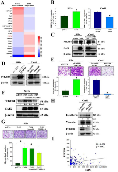 PFKFB4 is involved in CAIX-regulated cervical cancer migration. (A) Summary of mRNA array for CAIX overexpression in the SiHa cell line or CAIX-silencing in the Caski cell line according to log2 fold change. (B,C) The protein level and RNA level were detected by real-time PCR and Western blot. (D,E) After PFKFB4 overexpression in the SiHa cells or silencing in the Caski cells, Western blot and Boyden chamber assay were used for analysis. Scale bar, 100 μm. (F,G) After PFKFB4 knockdown in SiHa with stable CAIX overexpression, Boyden chamber assay and Western blot were used for analysis. Scale bar, 100 μm. (H) PFKFB4 knockdown in Caski cells and analysis by Western blot. (I) An association between CAIX and PFKFB4 mRNA levels in the TCGA database. (*, p < 0.05, compared to pcDNA or Scramble siRNA; #, p < 0.05, compared to CAIX).