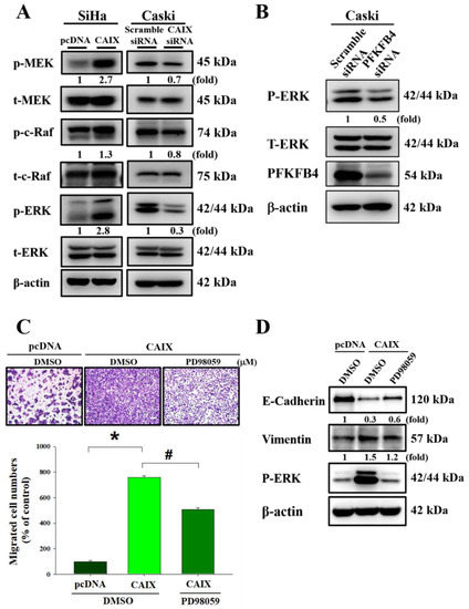 The MEK/Raf/ERK signaling pathways are crucial for CAIX-induced cell migration and EMT. (A) The levels of total and phosphorylated MEK, Raf, and ERK1/2 in SiHa and Caski cells with or without CAIX expression were determined using Western blot analyses. b-Actin was used as a loading control. (B) After knockdown PFKFB4 expression, total and phosphorylated ERK1/2 expression was determined using Western blot analyses. (C,D) Boyden chamber assay and Western blot was used to analyze the migration and protein level of PD98059 treating in SiHa cells with CAIX overexpression. Scale bar, 100 μm. (*, p < 0.05, compared to pcDNA or Scramble siRNA; #, p < 0.05, compared to CAIX).