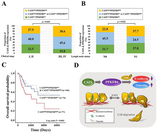 Clinical late-stage and lymph node metastasis are with CAIXhigh/PFKFB4high in cervical cancer patients. (A) The association of the combined expression of CAIX and PFKFB4 with the clinical stage (I–IV) or (B) lymph node metastasis (N0–N1) in patients with cervical cancer patients. Grouped by CAIXhigh/PFKFB4high, CAIXhigh/PFKFB4low or CAIXlow/PFKFB4high, and CAIXlow/PFKFB4low. (C) Kaplan–Meier curves for overall cervical cancer patient survival, grouped by CAIXhigh/PFKFB4high, CAIXhigh/PFKFB4low or CAIXlow/PFKFB4high, and CAIXlow/PFKFB4low. (D) Schematic summary of the CAIX-PFKFB4-EMT signaling pathway.