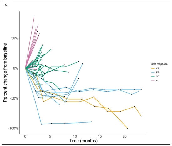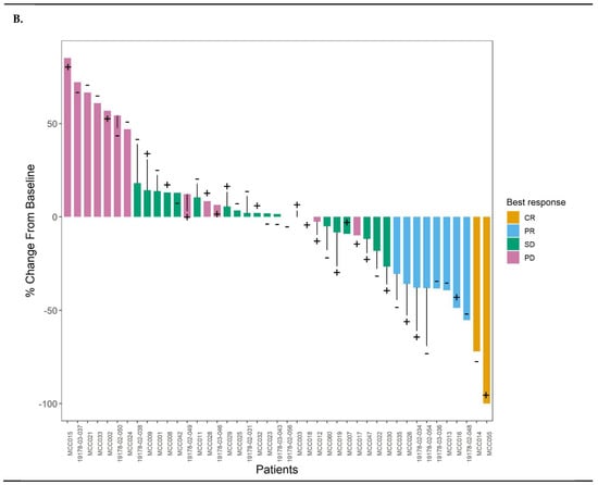 (A) Spider plot of best response. (B) Waterfall plot of best response. “+” indicates prior exposure to anti-PD-1 checkpoint inhibitors (CPI). “-” indicates no prior exposure to anti-PD-1 CPI.