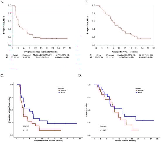 The overall response rate was 22.2%: 2 (4.4%) complete response, 9 (17.8%) partial response, 19 (42.2%) stable disease, and 16 (35.6%) progressive disease (Figure 1A,B). The median follow-up time for survival analyses of the study was 21.0 months calculated by the reverse KM method (data locked on 26 October 2020). The median progression-free survival (PFS) and 1-year PFS were 3.4 months and 19% (Figure 2A). The median OS and 1-year OS were 9.7 months and 44% (Figure 2B). Although some of the patients who were treated CPI prior to the study enrollment had objective responses, overall patients who did not receive CPI prior to receiving the cetuximab and nivolumab combination showed a trend to have better survival outcomes than patients who received prior CPI (Figure 2C,D). The PD-L1 CPS (<20 vs. ≥20) and p16 status did not associate with survival outcomes (Figure S2A,B).