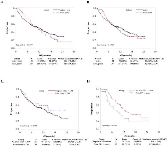 We found no significant difference in the OS between the combination cohort and RWD-CPI cohort (HR 0.91, 95% CI 0.63–1.36, Figure 3A) and between RWD-cetuximab and RWD-CPI cohorts (HR 0.94, 95% CI 0.70–1.29, Figure 3B). In addition, we explored whether there was any difference in the survival outcome depending on the sequence of the monotherapy. Again, the comparison cohorts were adjusted using propensity score matching before the survival analyses [25]. We found no significant OS difference between the patients with (N = 39) or without (N = 355) prior RWD-cetuximab treatments in the RWD-CPI cohort (HR 0.75, 95% CI 0.44–1.20, Figure 3C). However, we found a significant OS difference between the patients with (N = 29) or without (N = 53) prior RWD-CPI in the RWD-cetuximab cohort, favoring no prior RWD-CPI and subsequent receiving RWD-cetuximab (HR 1.81, 95% CI 1.02–3.16, Figure 3D).