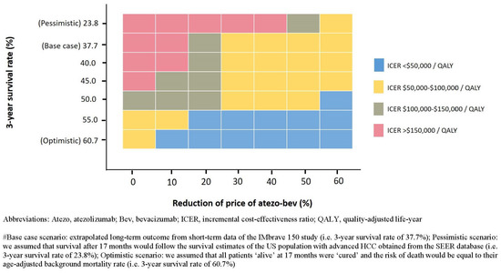 Atezo–bev represents a landmark breakthrough in HCC management as the first therapeutic strategy with demonstrated superiority over sorafenib. However, our results suggested that at the current price and treatment regime, its economic value remains uncertain. Moreover, our analyses showed that a price reduction might render payers more willing to bear the financial risk of uncertain long-term clinical outcomes. A moderate price reduction (20%) would allow the base case scenario to meet the WTP threshold of USD 150,000 per QALY. However, a substantial price reduction (47%) is needed for the modeled worst-case scenario. To justify the current price level, a 3-year survival rate of 50% is needed. When further expanded outcome data are reported, our model could provide a framework to adjust the price of atezo–bev in accordance with its long-term effectiveness.
