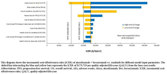 The promising activity of atezolizumab plus bevacizumab (atezo–bev) was first reported in a phase 1b trial, with an objective response rate of 36% and a median progression-free survival (PFS) of 7 months [14]. The IMbrave 150 study is a global, multi-center, randomized phase III trial evaluating the efficacy and safety of atezo–bev when compared with sorafenib in unresectable HCC patients who received no prior systemic therapy. The trial demonstrated a significant improvement in overall survival (OS) (hazard ratio (HR), 0.58; 95% CI, 0.42–0.79) and PFS (HR, 0.59; 95% CI, 0.47–0.76) in patients treated with atezo–bev [15], leading to the approval of this combination by the FDA. However, due to the high cost of research and development, the legislation preventing Medicare from being able to negotiate the drug prices, and a lack of value-based pricing system, like many new cancer drugs, the atezo–bev combination is expensive. Therefore [16], it is pressing to define its value for policymakers, payers, patients, and clinicians, particularly from the global perspective given the high incidence of HCC in economically disadvantaged regions worldwide [17,18].
