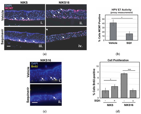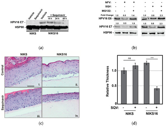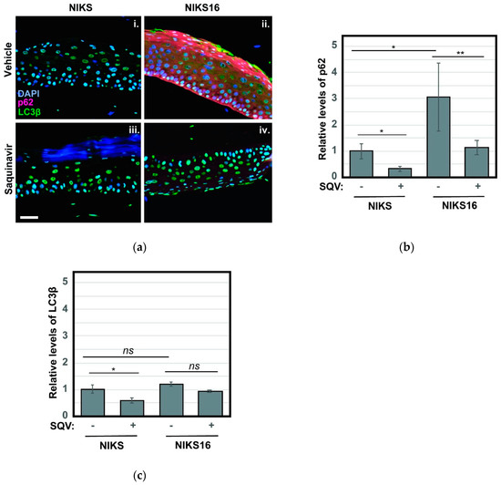 2.3. Saquinavir Slows Cell Growth and Reverses HPV16-Associated Increases to Markers of Autophagy in HPV16-Positive NIKS16 3-D Organotypic Raft Cultures