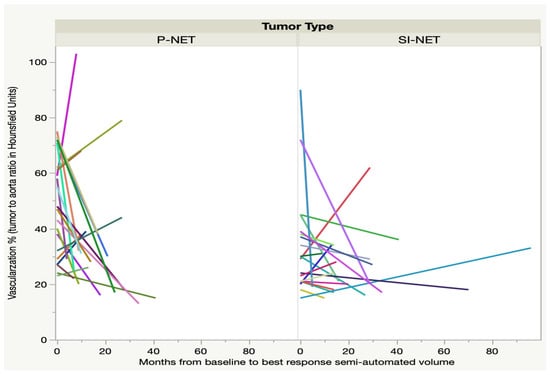 At the time of best response, as regards the semi-automated volume, after three to nine months, only 21 P-NEN patients and 20 SI-NEN patients underwent contrast-enhanced CT. In the majority of lesions, the tumor-to-aorta attenuation (HU) ratio decreased significantly from baseline in the P-NEN group (p < 0.01) but not in the SI-NEN group (p > 0.05). For some of the NEN lesions, 7/21 (33%) P-NENs and 5/20 (25%) SI-NENs, there was instead an increase of the tumor-to-aorta attenuation (HU) until best response, as shown in Figure 1. After the time of best response, the vascularization ratio of the P-NENs leveled out to that of the SI-NENs and then remained stable over the course of follow-up.