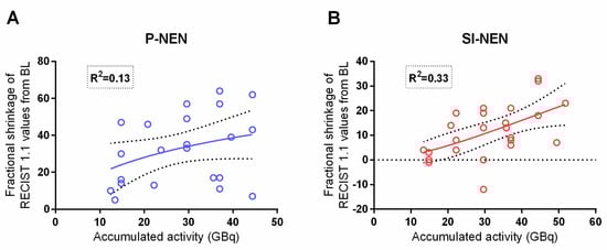 The total amount of administered activity was 731.5 GBq to the P-NEN group and 899.3 GBq to the SI-NEN group. Due to the clinical and hematological status of the patients, the administered activity for some of the PRRT cycles was reduced. In the P-NEN group, this was the case in 9/100 (9%) cycles in 5/23 (22%) patients, resulting in a median of 29.6 GBq (range 13.4–44.4; mean ± SEM 31.8 ± 1.9 GBq) per patient. For the same clinical reasons, the time interval between treatment cycles was extended beyond eight weeks in 4/100 (4%) cycles in 4/23 (17%) P-NEN patients. Correspondingly, in the SI-NEN group, the administered activity was reduced for 10/124 (8%) cycles in 5/25 (20%) patients with a subsequent median of 37 GBq (range 20.8–51.8; mean ± SEM 36 ± 1.9 GBq) per patient [17]. The time interval between treatment cycles was extended for 27/124 (17%) cycles in 15/25 (60%) of the SI-NEN patients. Thus, the total amount of administered activity throughout the course of PRRT was similar in both groups of NEN patients (p > 0.05), as was the accumulated administered activity until best response, i.e., the maximum fractional shrinkage of the tumor diameter, semi-automated volume and RECIST 1.1 results. In the SI-NEN group, the correlation between accumulated administered activity and RECIST 1.1 values (p = 0.003) was consistent with our earlier report [17], but no such correlation was found in the P-NENs, as shown in Figure 2.