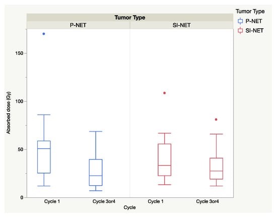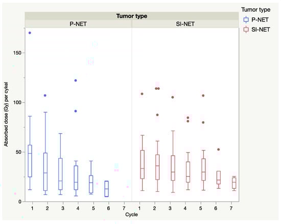 In general, when considering all dosimetry calculations, including those with a short 24 h dosimetry protocol, the median absorbed dose declined from the first to the last cycle and was more pronounced in P-NENs than in SI-NENs, as shown in Figure 4.