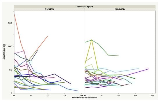 Individual tumors do not only consist of the malignant cell clone itself, but comprise a complex mixture of tumor vessels, supportive tissues, tumor fibroblasts and immunoactive cells, all with varying likelihoods of responding to therapy [22]. This needs to be considered as a contributing factor when trying to understand the current different response patterns between the P-NENs and SI-NENs. It is also well-understood that the effect of low-dose-rate radiation is difficult to evaluate and that biological effects depend on both the cellular and intracellular distribution of the radionuclide. Thus, even if the macroscopic dose to the tumor is similar, the effects can be different on a cellular and subcellular level [23,24]. This was illustrated by the differences in tumor shrinkage between P-NENs, and SI-NENs despite similar administered activity and absorbed dose.