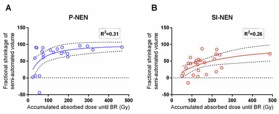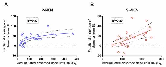 The correlation between the accumulated absorbed dose and maximal fractional semi-automated volume shrinkage was significant and rather similar between P-NENs and SI-NENs, as Figure 7 shows.