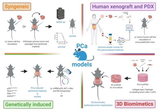Despite all these models, establishing standardized, relevant, feasible, and reproducible PCa mice models remains a challenge. In general, peritoneal tumor burden or cancer progression in PCa mouse models can be quantified by (i) bioluminescence or biofluorescence: With the use of a tumor cell line engineered to express a reporter gene [22,23]; (ii) number and weight of peritoneal implants and/or omentum; iii) quantification of tumor burden by RT-PCR, immunohistochemistry, in vivo fluorescence microscopy, and flow cytometry, among other techniques [10,24]; (iv) ascites: Volume collected, hemorrhagic status; (v) survival: Mouse life span is evaluated by surveillance of spontaneous death or by euthanasia of animals with signs of pain or suffering according to established ethical protocol criteria [25,26]. Here, we provide a brief overview of reported mouse models to explore PCa in translational biomedical research (Figure 1).