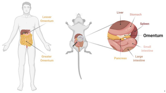 Anatomy and localization of human and mouse omentum. The mouse omentum is a thin, slightly elongated, and vascularized tissue located under the stomach and between the spleen and pancreas. Created with BioRender.com, accessed on 19 February 2021.