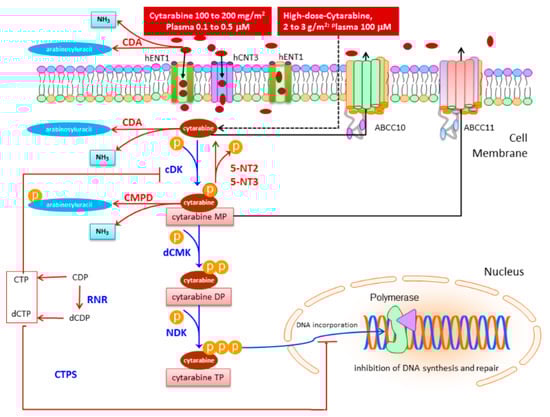 Cytarabine gains entry into cells primarily as a false substrate through specialized nucleoside transporter proteins of SLC family, the human equilibrative nucleoside transportershENT1 and hENT2 (encoded by the gene SLC29A1 and SCL29A2, respectively) [91,92,93,94] and the human concentrative nucleoside transporters hCNT3 (encoded by the gene SLC28A3) [95,96,97,98]. Uptake and accumulation of cytarabine is also regulated by transmembrane transporter proteins of the ABC family, also called human multidrug resistance-associated protein (MRP) family, namely ABCC10 (MRP7) and ABCC11 (MRP8) specifically committed to efflux of deoxynucleotides inactive metabolites and to temper intracellular pools of phosphorylated deoxynucleotides (Figure 1) [99,100].