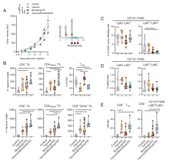 Vaccine synergizes with Bintrafusp alfa/SX-682 and increases TIL in MC38-CEA tumors. (A) CEA.Tg mice were injected s.c. with 3 × 105 MC38-CEA in the flank. On day 7, mice were started on a control or SX-682 diet (200 mg/kg body weight/day), and on days 14, 17, and 21 mice received i.p. injections of 200 μg bintrafusp alfa. Priming vaccine dose of s.c. Ad-CEA (1 × 1010 viral particles) was administered on day 7 with a boosting dose of Ad-CEA/N-803 (1 × 1010 viral particles, N-803, 1 μg, s.c.) on day 14. Graph shows average tumor growth and error bars indicate SEM of biological replicates; n = 8 mice/group. * p ≤ 0.05; *** p ≤ 0.001 for two-way ANOVA in (A). Control indicates mice that were left untreated and fed a base diet without SX-682. Tumors (B,C) and spleens (D) were harvested and analyzed by flow cytometry on day 23 for lymphocytes (B) and myeloid cells (C,D). (E) Cell ratios comparing the number of cells per mg tumor weight were also calculated. Individual points represent data from one tumor. ns, not significant; * p ≤ 0.05; ** p ≤ 0.01; *** p ≤ 0.001; **** p ≤ 0.0001 for one-way ANOVA followed by Tukey’s post hoc test in (B–E). i.p. = intraperitoneal. s.c. = subcutaneous. TIL = tumor-infiltrating lymphocyte. Tregs = regulatory T cells.