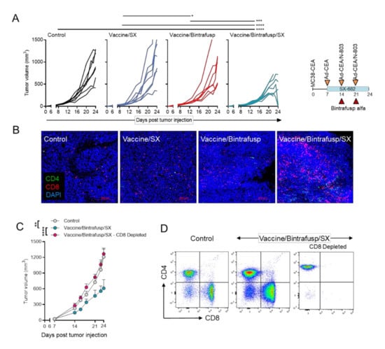 Vaccine combination immunotherapy is dependent on CD8+ TIL. (A) CEA.Tg mice were injected s.c. with 3 × 105 MC38-CEA in the flank. On day 7, mice were started on a control or SX-682 diet (200 mg/kg body weight/day). On days 14 and 21, mice received i.p. injections of 200 μg bintrafusp alfa. A priming vaccine dose of s.c. Ad-CEA (1 × 1010 viral particles) was administered on day 7 with a boosting dose of Ad-CEA/N-803 vaccine on days 14 and 21 (1 × 1010 viral particles, N-803, 1 μg, s.c.). Shown are the individual tumor growths for mice in the Control, Vaccine/SX, Vaccine/Bintrafusp, and Vaccine/Bintrafusp/SX groups; n = 7 mice/group. Control indicates mice that were left untreated and fed a base diet without SX-682. (B) Representative images of indicated tumors stained for CD4+ (green) and CD8+ (red) T cells and DAPI (blue) by immunofluorescence. (C) MC38-CEA tumor-bearing CEA.Tg mice received Vaccine/Bintrafusp/SX as in (A). Additionally, mice receiving Vaccine/Bintrafusp/SX also received depleting antibodies for CD8+ cells starting on day 5; n = 7 (Control and Vaccine/Bintrafusp/SX – CD8 Depleted) or 5 (Vaccine/Bintrafusp/SX) mice/group. (D) Flow profiles confirming efficacy of CD8 depletion antibodies from (C). Error bars indicate SEM of biological replicates. * p ≤ 0.05; ** p ≤ 0.01; *** p ≤ 0.001; **** p ≤ 0.0001 for two-way ANOVA in (A,C). i.p. = intraperitoneal. s.c. = subcutaneous. TIL = tumor-infiltrating lymphocyte.
