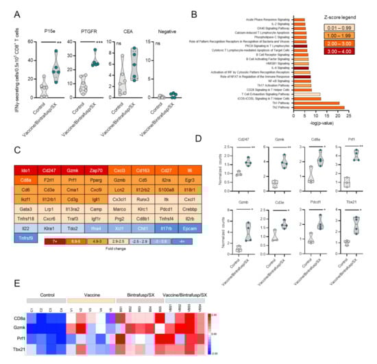 Immune activation signature observed in MC38-CEA tumors treated with Vaccine/Bintrafusp/SX combination. CEA.Tg mice were injected s.c. with 3 × 105 MC38-CEA in the flank. On day 7, mice were started on a control or SX-682 diet (200 mg/kg body weight/day). On days 14 and 21, mice received i.p. injections of 200 μg bintrafusp alfa. A priming vaccine dose of s.c. Ad-CEA was administered on day 7 (1 × 1010 viral particles) with a boosting dose of Ad-CEA/N-803 vaccine on days 14 and 21 (1 × 1010 viral particles, N-803, 1 μg, s.c.). (A) IFNγ ELISPOT analysis of spleens collected on day 24 from Control and Vaccine/Bintrafusp/SX-treated mice against MC38-CEA tumor antigens. Control indicates mice that were left untreated and fed a base diet without SX-682; n = 7 (Control) or 5 (Vaccine/Bintrafusp/SX) mice/group. Tumors collected on day 24 were used for RNA preparation and NanoString analysis as described in the Materials and Methods. Shown in (B) is an Ingenuity Pathway Analysis performed on genes that were found to be up- or down-regulated more than 2-fold in Vaccine/Bintrafusp/SX-treated tumors compared to Control tumors; n = 3 mice/group. (C) Heat map of genes differentially expressed >2.5-fold in Vaccine/Bintrafusp/SX-treated tumors compared to Control tumors; n = 3 mice/group. (D) Real-time PCR analysis confirming selected genes upregulated in Vaccine/Bintrafusp/SX-treated tumors compared to Control tumors; n = 3 (Control) or 4 (Vaccine/Bintrafusp/SX) mice/group. Individual points represent data from one tumor. ns, not significant; * p ≤ 0.05; ** p ≤ 0.01; *** p ≤ 0.001 for two-tailed Student’s t-test in (A,D). (E) Heat map expression of indicated genes in MC38-CEA tumors treated as per the schedule of administration in Figure 1. Tumor RNA was prepared at day 23; RNA expression of indicated genes was evaluated by real-time PCR as described in the Materials and Methods.