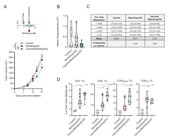 To corroborate the results in a different tumor model, a single dose of bintrafusp alfa in combination with SX-682 was given to 4T1 tumor-bearing mice which, as expected, failed to control tumor growth (Bintrafusp/SX, Figure 4A). In this mammary carcinoma model, vaccine was administered as a priming dose of Ad-Twist on day 7 with a boosting vaccine on day 14 consisting of Ad-Twist plus N-803. Twist1, a transcription factor that drives metastasis, was identified and characterized as a targetable “self” tumor-associated antigen in 4T1 tumor cells [22]. Addition of vaccine to Bintrafusp/SX therapy induced only a modest delay in primary tumor growth (Vaccine/Bintrafusp/SX, Figure 4A), and a trend towards reduced number of lung metastases (Figure 4B), with a 76% reduction of metastases in the Vaccine/Bintrafusp/SX group compared with the Control (Figure 4C). Two caveats with these results, however, are the low number of mice evaluated in each group, and the reduction of primary tumor volume in the Vaccine/Bintrafusp/SX group that could directly impact the number of disseminated cells.