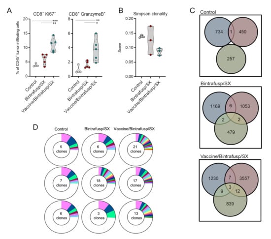 The quality of the T-cell infiltrates in 4T1 tumors of Bintrafusp/SX ± vaccine-treated mice was further evaluated. Intracellular flow cytometry-based analysis of tumor-infiltrating T cells from Vaccine/Bintrafusp/SX-treated mice revealed significantly higher frequencies of proliferative (CD8+ Ki67+) and cytotoxic (CD8+ Granzyme B+) TIL compared to tumors in the Bintrafusp/SX and Control groups (Figure 5A). TCRβ sequencing analysis was also performed on whole tumor lysates from 3 individual tumors per group; addition of vaccine to Bintrafusp/SX resulted in reduced clonality (Figure 5B) and expanded the T-cell repertoire compared with Control and Bintrafusp/SX-treated tumors, with an average of 481 ± 240, 907 ± 372, and 1897 ± 1469 productive TCRβ rearrangements in the Control, Bintrafusp/SX and Vaccine/Bintrafusp/SX groups, respectively (Figure 5C).