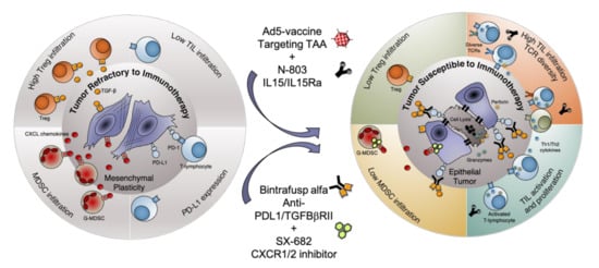 - A Horn, L.; Riskin, J.; A Hempel, H.; Fousek, K.; Lind, H.; Hamilton, D.H.; McCampbell, K.K.; Maeda, D.Y.; A Zebala, J.; Su, Z.; et al. Simultaneous inhibition of CXCR1/2, TGF-β, and PD-L1 remodels the tumor and its microenvironment to drive antitumor immunity. J. Immunother. Cancer 2019, 8, e000326. [Google Scholar] [CrossRef] [PubMed]