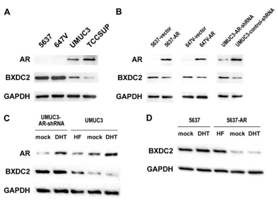 Relationship between androgen receptor (AR) and BXDC2 expression in bladder cancer cells. (A) Western blotting of AR and BXDC2 in 5637, 647V, UMUC3, and TCCSUP. (B) Western blotting of AR and BXDC2 in 5637-vector vs. 5637-AR, 647V-vector vs. 647V-AR, and UMUC3-AR-shRNA vs. UMUC3-control-shRNA. (C) Western blotting of AR and BXDC2 in UMUC3-AR-shRNA or UMUC3 cultured for 24 h with ethanol (mock), 10 nM DHT, or 5 µM HF. (D) Western blotting of BXDC2 in 5637 or 5637-AR cultured for 24 h with ethanol (mock), 10 nM DHT, or 5 µM HF. GAPDH served as a loading control.